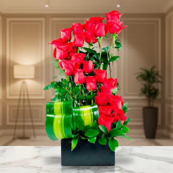 Sorprende con la elegancia del Arreglo con 24 rosas rojas en diseño espiral, acompañado de frescos follajes verdes. El regalo perfecto para expresar amor y admiración. 💖🌿