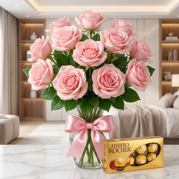 ¡Exprésalo con flores y dulzura! 💖 Este romántico jarrón combina 18 rosas rosas, follaje fresco y chocolates Ferrero Rocher para crear un regalo inolvidable. Perfecto para enamorar, agradecer o sorprender. ✨🎁