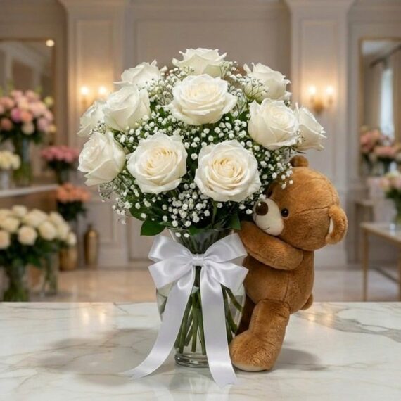 ¡Un detalle que enamora! 💘 Este tierno arreglo con 12 rosas rojas, follaje fresco y un adorable oso de peluche es perfecto para sorprender con amor y dulzura. 🎁❤️