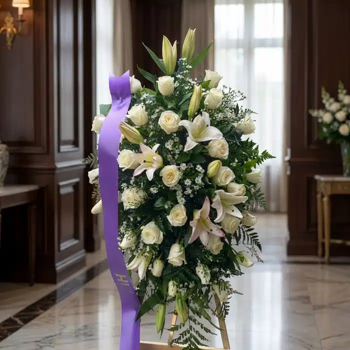 En Feria de Flores, creamos homenajes florales que transmiten paz y respeto. El Pedestal Salvación combina lirios blancos, rosas, margaritas y follajes verdes para despedir con elegancia y significado. 🌸🌹🌼