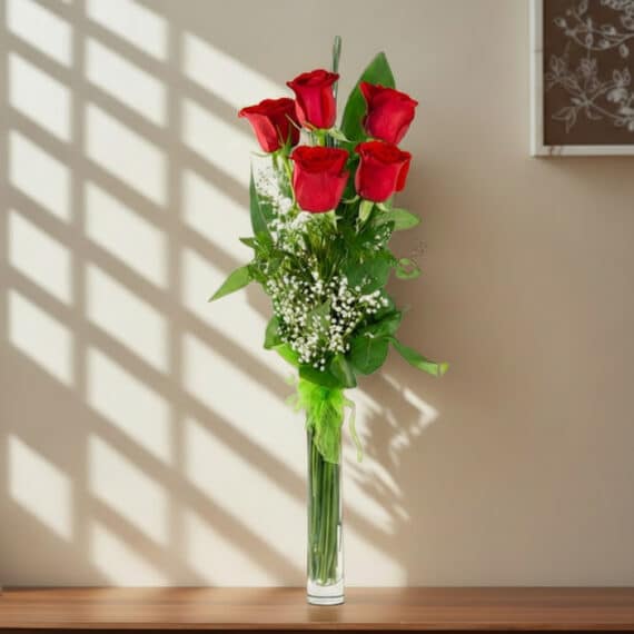 Este elegante diseño de Feria de Flores incluye 5 Rosas Marilyn frescas sobre una delicada base de vidrio, acompañadas de follajes verdes que realzan su belleza. Ideal para sorprender a alguien especial. 💖✨