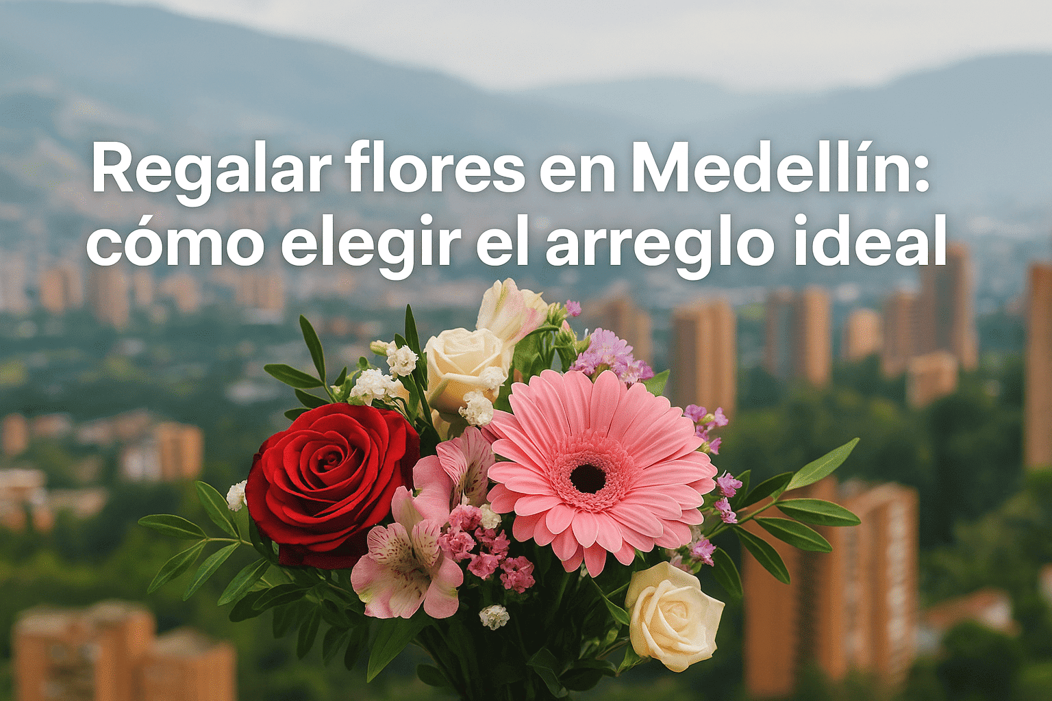 Ramo de flores con rosa roja y gerbera rosa frente al paisaje urbano de Medellín con texto Regalar flores en Medellín: cómo elegir el arreglo ideal